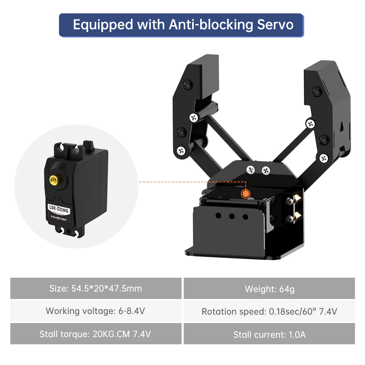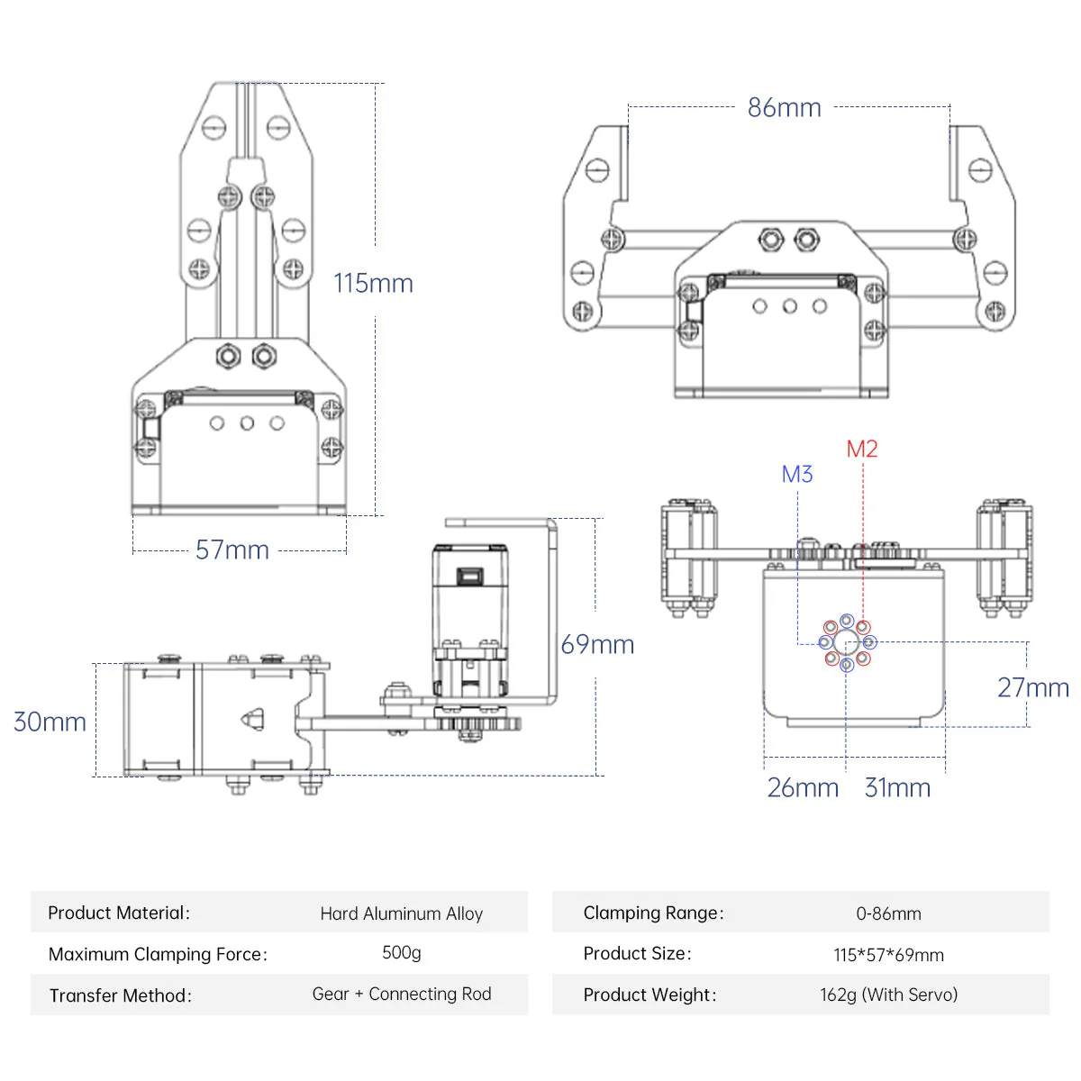 BigClaw Mechanical Gripper for Robot DIY: Kẹp gắp cơ khí BigClaw dành cho robot DIY 【Lưu ý】Nếu gói hàng gặp vấn đề thiếu linh kiện hoặc lỗi servo, vui lòng liên hệ với chúng tôi để được hỗ trợ giải quyết. 【Diện tích tiếp xúc lớn】Kẹp có diện tích tiếp xúc lớn giúp gắp vật dễ dàng và ổn định hơn. 【Cấu trúc kim loại hoàn toàn】Khung nhôm giúp BigClaw nhẹ hơn và bền hơn. 【Kẹp song song đối xứng】Thiết kế kẹp song song và đối xứng giúp dễ dàng gắp các vật thể có nhiều hình dạng khác nhau. 【Lỗ lắp đặt】Các lỗ M3 và M4 trên kẹp được thiết kế để hỗ trợ mở rộng DIY.