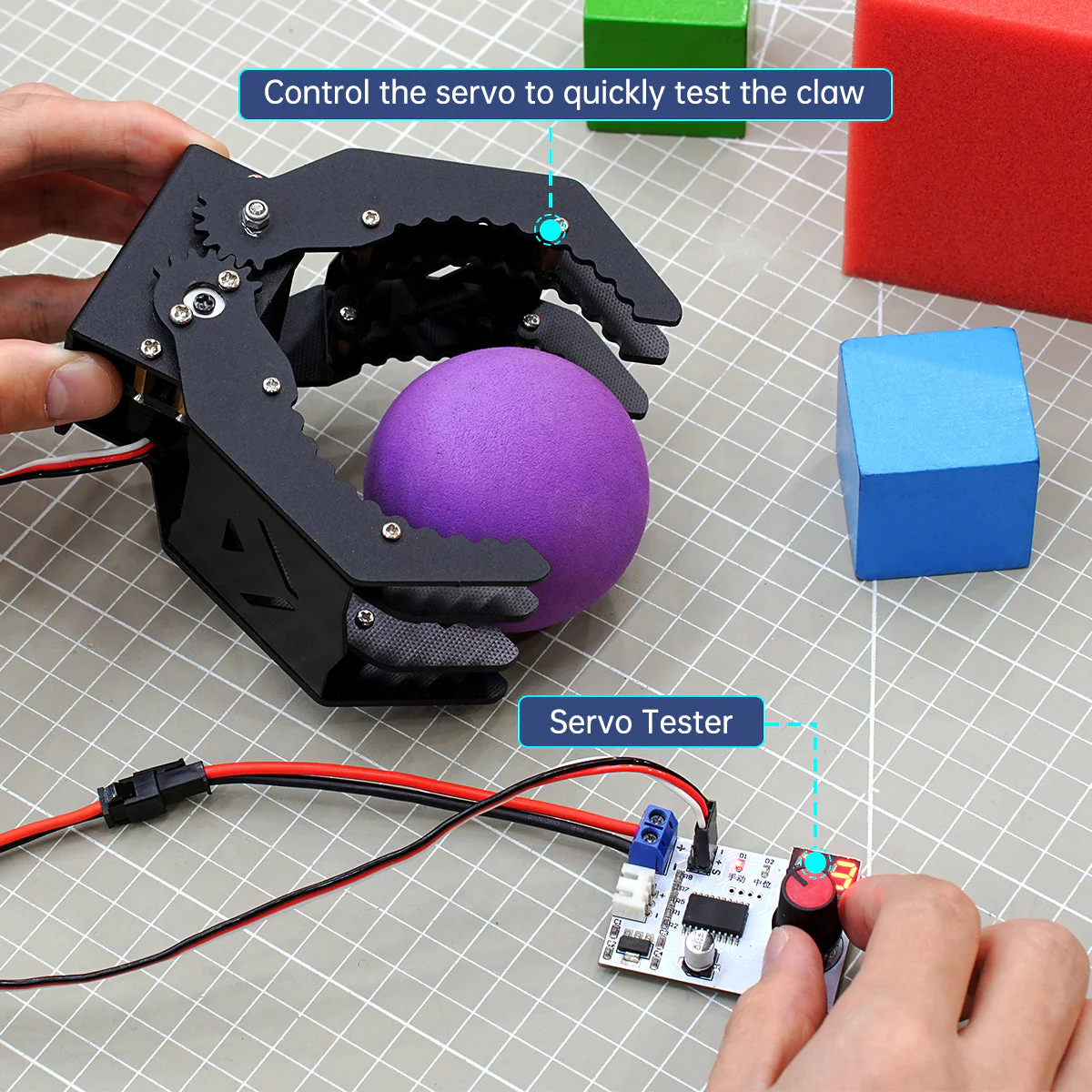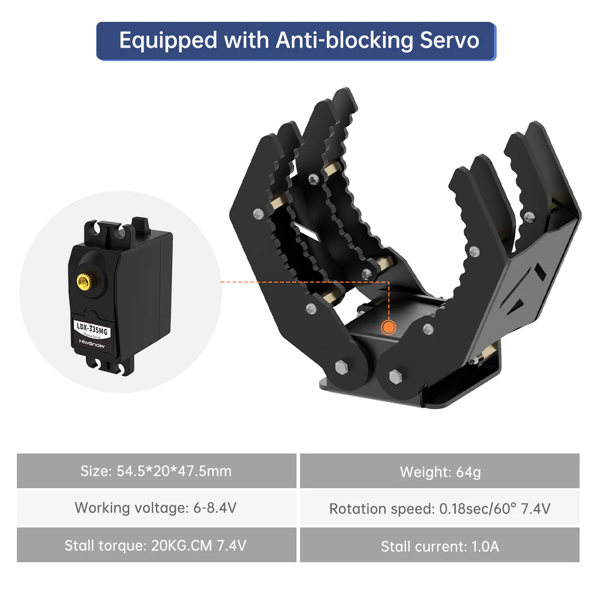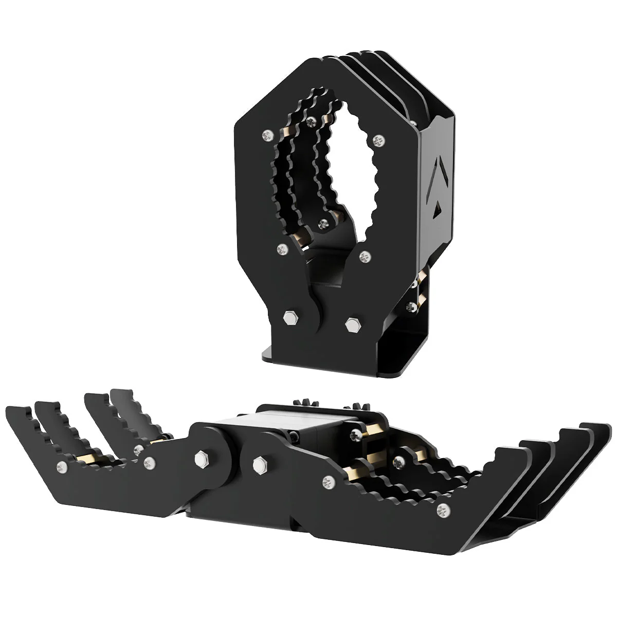 Black Metal Mechanical Gripper for Robot DIY: Kẹp gắp cơ khí kim loại màu đen cho robot DIY 1.Mép bên trong của kẹp được thiết kế dạng sóng, giúp kẹp chắc chắn và ổn định hơn. 2.Kẹp đối xứng, dễ dàng xác định vị trí vật thể 3.Trang bị servo mô-men xoắn lớn, chống cháy, có thể gắp vật nặng lên đến 500g 4.Có nhiều lỗ M2 và M3 ở đầu kẹp để hỗ trợ mở rộng DIY 5.Các chốt giới hạn giúp tránh bị kẹp tay