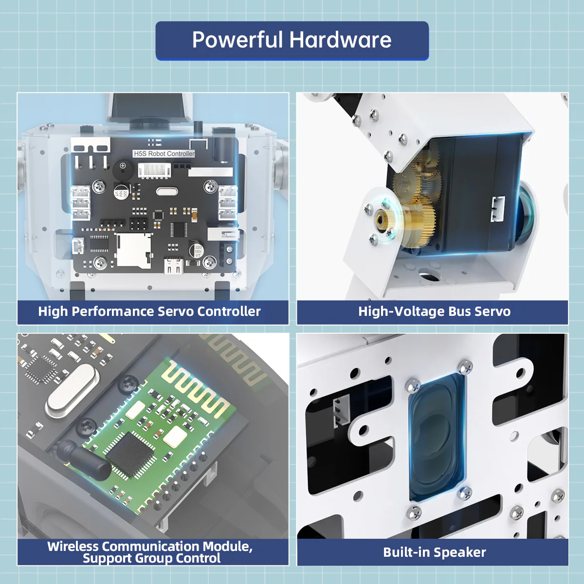 H5S Hiwonder Robot hình người thông minh 16DOF hỗ trợ trình diễn giải trí 【Phần cứng mạnh mẽ】 Được trang bị bộ điều khiển servo hiệu suất cao, tích hợp module MP3, cảm biến IMU, Bluetooth 4.0 và module không dây 2.4G, hỗ trợ điều khiển theo nhóm. 【Robot hình người thông minh H5S】 H5S sử dụng thuật toán dáng đi tốc độ cao, có thể dễ dàng thực hiện các chức năng như đi bộ, nhảy múa, đá, đấm, v.v., linh hoạt và nhanh nhẹn. 【Hỗ trợ nhiều phương thức điều khiển】 H5S không chỉ hỗ trợ điều khiển bằng phần mềm đồ họa trên PC mà còn cho phép thiết lập chuyển động robot tùy ý. Ngoài ra, robot còn hỗ trợ điều khiển độc lập qua ứng dụng và điều khiển nhóm qua APP, mang lại trải nghiệm điều khiển mượt mà.