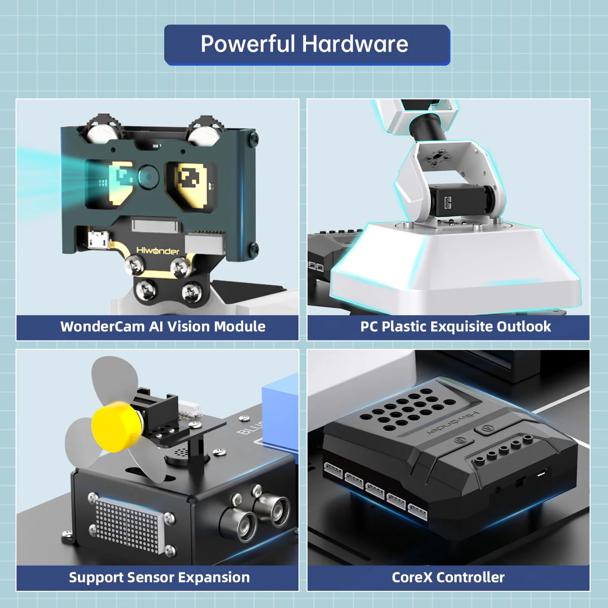 Hiwonder AiArm Cánh tay robot thị giác AI dùng cho giáo dục, hỗ trợ Scratch và Python 【Hệ thống trình diễn giáo dục AI chất lượng cao】 AiArm là cánh tay robot thị giác thông minh sử dụng bộ điều khiển CoreX do hãng tự phát triển. Sản phẩm được trang bị servo thông minh hiệu suất cao và module thị giác, có thể lập trình bằng Scratch và Python. Với khả năng mạnh mẽ, AiArm mở ra nhiều ứng dụng AI đa dạng như nhận diện và gắp vật thể dựa trên thị giác. 【Nhận diện và theo dõi bằng thị giác AI】 AiArm kết hợp module thị giác AI WonderCam để nhận diện và định vị đối tượng mục tiêu, cho phép triển khai các ứng dụng AI như phân loại màu sắc và phân loại rác. 【Nhiều phương thức điều khiển chuyển động】 Dù là điều khiển bằng phần mềm PC, điều khiển offline hay điều khiển bằng động học nghịch, bạn đều có thể linh hoạt thiết kế và chỉnh sửa các hành động khác nhau, khai thác tối đa khả năng của cánh tay robot. 【Mở rộng cảm biến đa dạng】 Khi tích hợp với các cảm biến và module, AiArm có thể thực hiện nhiều chức năng thú vị như quạt theo dõi khuôn mặt AI, săn tìm mục tiêu bằng siêu âm, v.v.