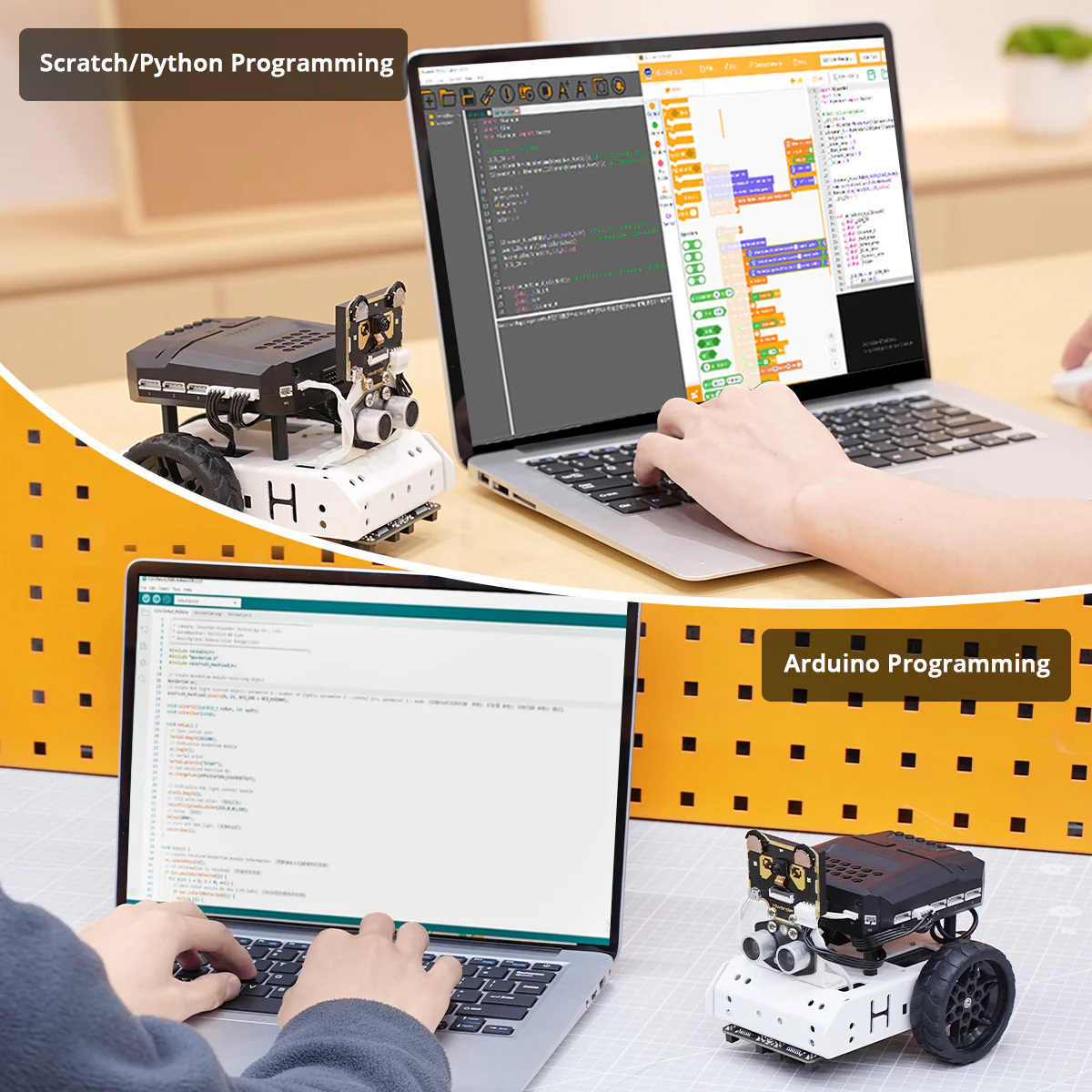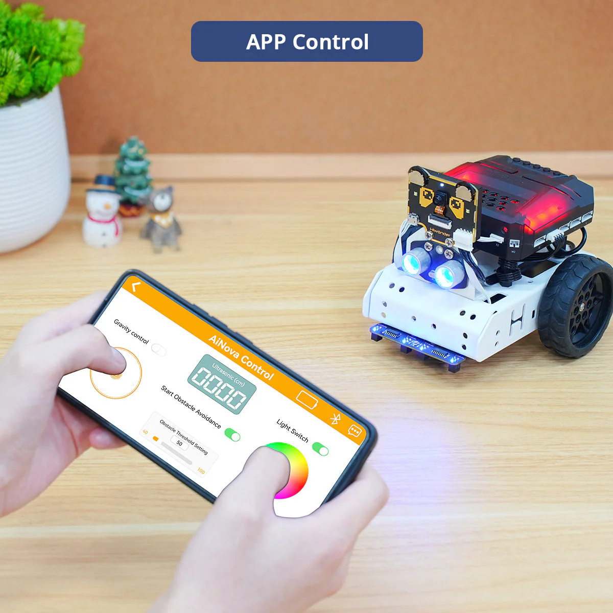 Hiwonder AiNova Xe robot thị giác thông minh hỗ trợ lập trình Python đồ họa / Scratch / Arduino 【Lập trình Scratch, robot thị giác AI】 AiNova là xe robot thông minh AI sử dụng Scratch. Sản phẩm được trang bị module thị giác AI WonderCam hiệu năng cao với camera HD tích hợp. Module này cho phép triển khai nhiều ứng dụng AI như nhận diện màu sắc, bám line bằng thị giác, theo dõi mục tiêu, v.v. 【Phần cứng mạnh mẽ】 AiNova sở hữu nhiều tính năng trong một thiết kế nhỏ gọn, bao gồm cảm biến dò line 4 kênh độ chính xác cao, module thị giác AI, cảm biến siêu âm phát sáng, động cơ encoder, bộ thu hồng ngoại, đèn RGB và nhiều linh kiện điện tử khác. 【Huấn luyện và học tập chỉ với một lần nhấn】 Module thị giác AI của AiNova tích hợp sẵn một số thuật toán học, cho phép thực hiện nhiều dự án AI như phân loại hình ảnh và học đặc trưng. 【Hỗ trợ nhiều phương thức lập trình】 AiNova hỗ trợ lập trình bằng Scratch và Python. Lập trình đồ họa thân thiện với người mới bắt đầu, trong khi Python phù hợp cho người dùng muốn đào sâu vào lập trình.