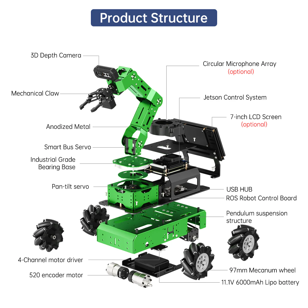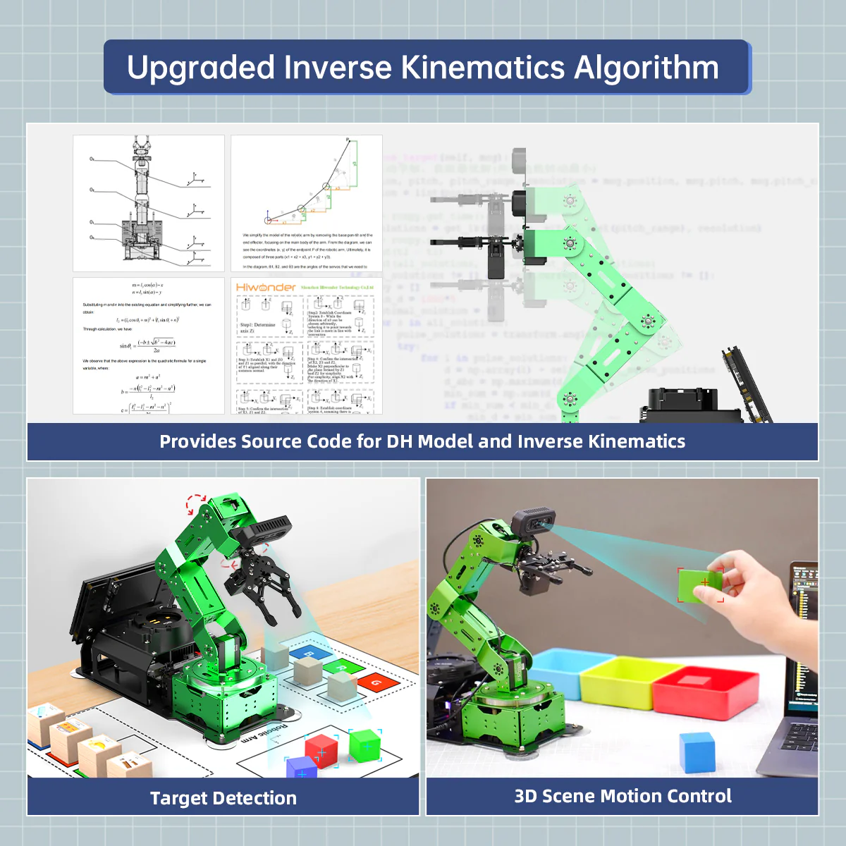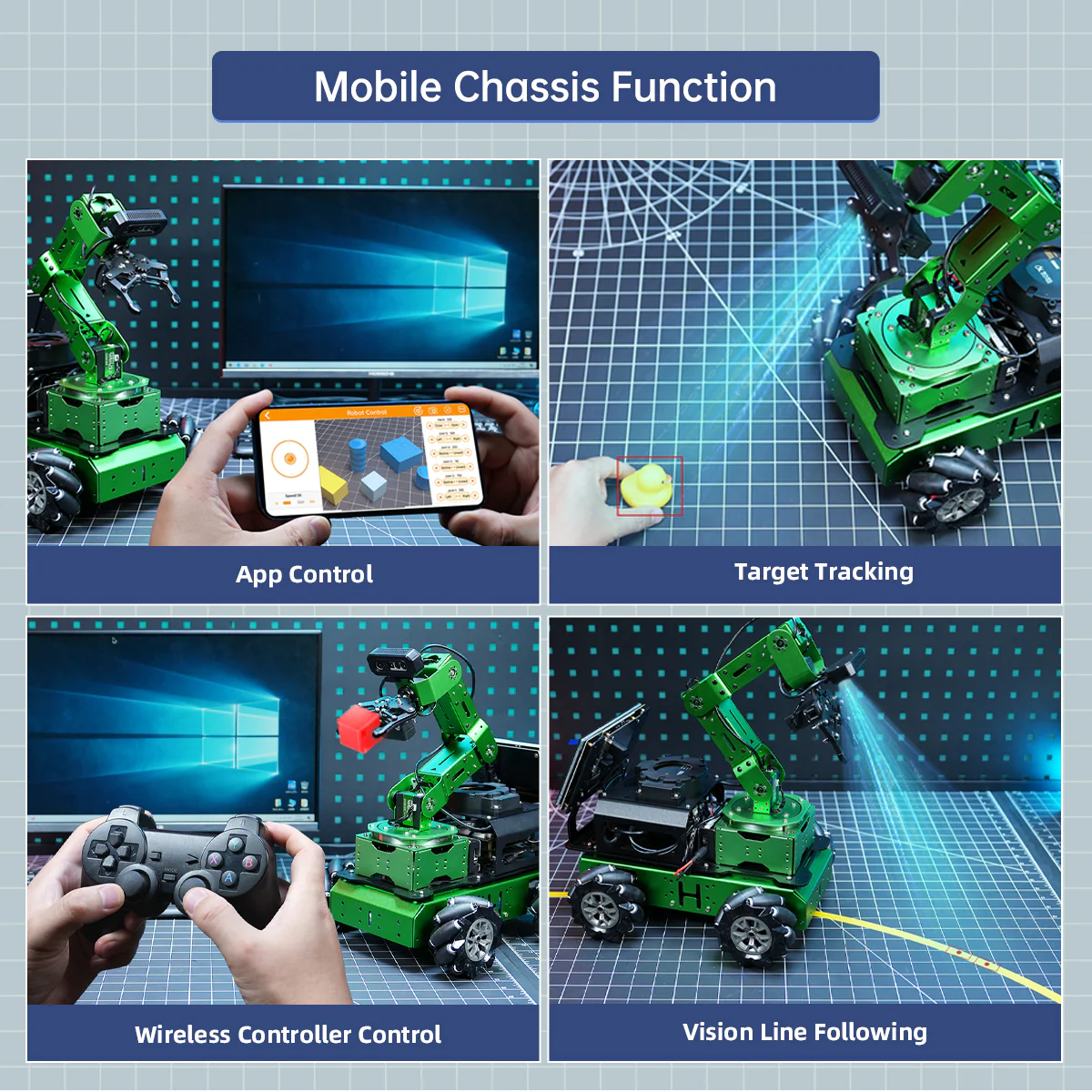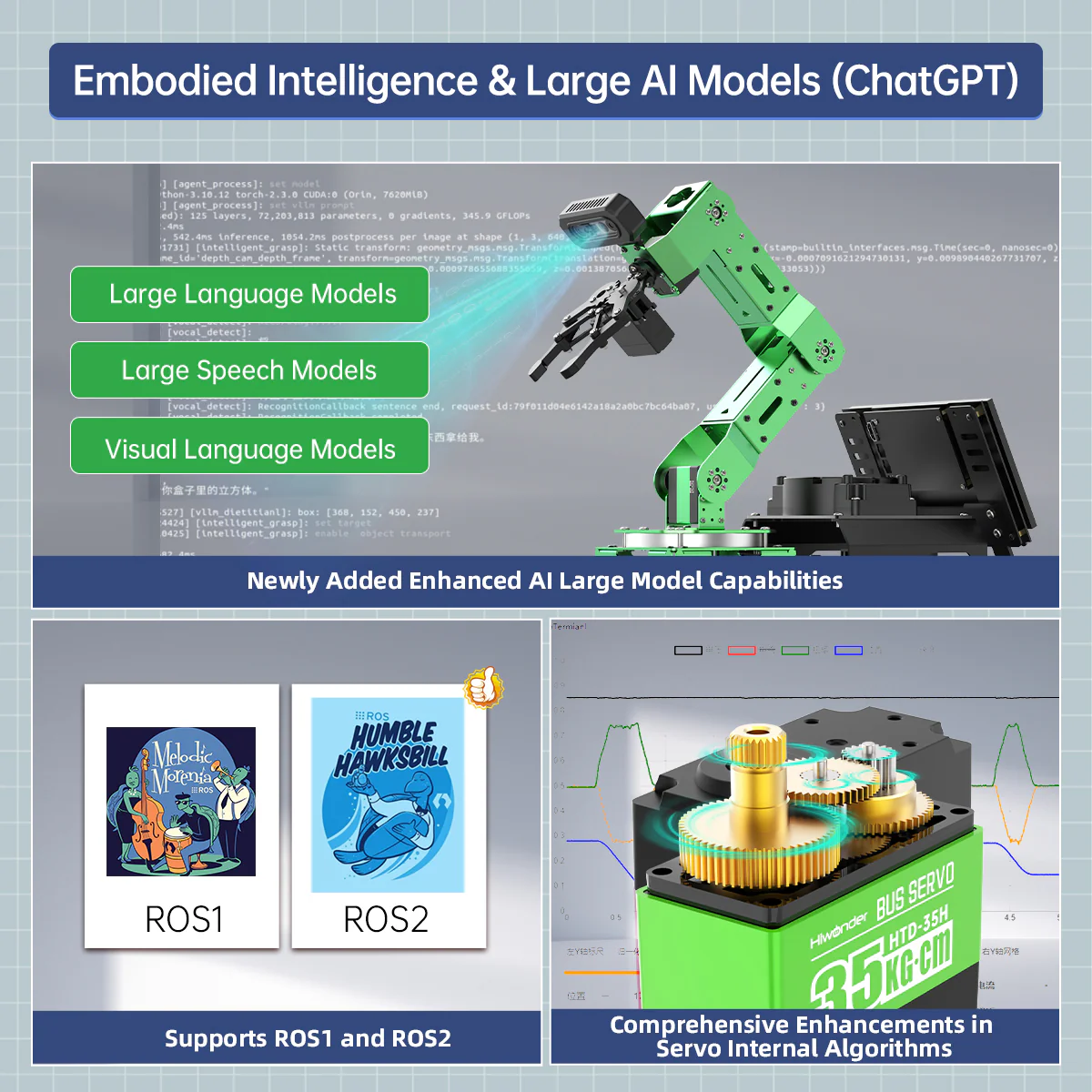 Hiwonder JetArm Pro Robot Thị giác 3D ROS1 ROS2, tích hợp Mô hình AI đa phương thức (ChatGPT), Tương tác giọng nói và thị giác AI, Hỗ trợ khung gầm, thanh trượt, băng tải mở rộng 【Điều khiển bởi AI & sử dụng Jetson】 JetArm Pro là cánh tay robot thị giác 3D hiệu năng cao được phát triển cho các kịch bản giáo dục ROS. Thiết bị được trang bị Jetson Nano, Orin Nano hoặc Orin NX làm bộ điều khiển chính và tương thích hoàn toàn với cả ROS1 và ROS2. Với Python và các framework deep learning được tích hợp, JetArm Pro là nền tảng lý tưởng để phát triển các dự án AI phức tạp. 【Robot AI hiệu năng cao & thị giác 3D】 JetArm Pro được trang bị sáu servo thông minh mô-men xoắn cao, camera độ sâu 3D, màn hình cảm ứng 7 inch và cụm micro đa hướng — kết hợp phần cứng mạnh mẽ để hỗ trợ nhiều khả năng AI như gắp vật thể trong không gian 3D, theo dõi mục tiêu, phân loại vật thể, điều khiển bằng giọng nói và các ứng dụng embodied AI. 【Tăng cường tương tác người–robot nhờ AI】 JetArm Pro tận dụng các mô hình AI lớn đa phương thức để xây dựng hệ thống tương tác lấy ChatGPT làm trung tâm. Kết hợp với khả năng thị giác 3D, JetArm Pro sở hữu năng lực nhận thức, suy luận và hành động vượt trội, cho phép triển khai các ứng dụng embodied AI tiên tiến và mang lại trải nghiệm tương tác người–robot tự nhiên, trực quan. 【Mở rộng đa phương thức linh hoạt】 Hỗ trợ bánh Mecanum và khung gầm xe tăng, thanh trượt điện và băng tải, JetArm Pro dễ dàng thích ứng với các ứng dụng AI sáng tạo như vận chuyển thông minh, dò line và quy trình tự động hóa — rất phù hợp để xây dựng các kịch bản AI nâng cao có khả năng mở rộng. 【Công nghệ tiên tiến & tài liệu hướng dẫn toàn diện】 Với JetArm Pro, bạn sẽ làm chủ nhiều công nghệ hiện đại như phát triển ROS, thị giác độ sâu 3D, OpenCV, YOLOv11, MediaPipe, mô hình AI, động học nghịch robot, MoveIt, mô phỏng Gazebo và tương tác giọng nói. Chúng tôi cung cấp tài liệu học tập chuyên sâu và video hướng dẫn từng bước, giúp bạn tự tin phát triển cánh tay robot AI của riêng mình.