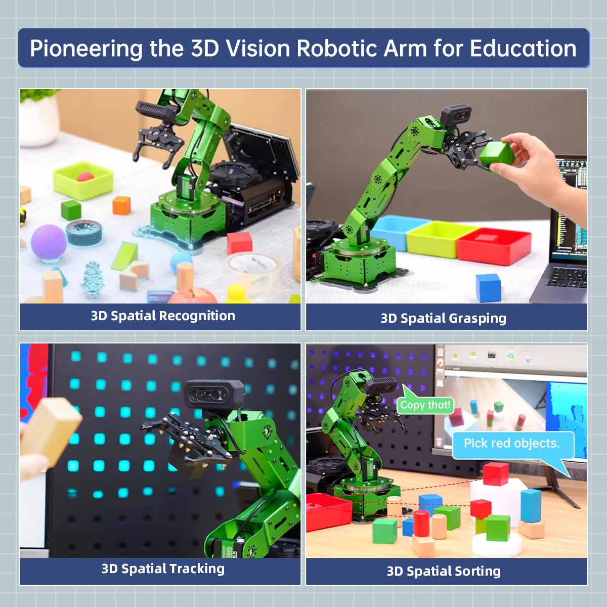 Hiwonder JetArm Cánh tay Robot Thị giác 3D ROS1/ROS2, tích hợp Mô hình AI đa phương thức (ChatGPT), Tương tác giọng nói AI và Nhận dạng thị giác, Theo dõi & Phân loại 【Điều khiển bởi AI & sử dụng Jetson】 Hiwonder JetArm là cánh tay robot thị giác 3D hiệu năng cao được phát triển cho các kịch bản giáo dục ROS. Thiết bị được trang bị Jetson Nano, Orin Nano hoặc Orin NX làm bộ điều khiển chính và tương thích hoàn toàn với cả ROS1 và ROS2. Với Python và các framework deep learning được tích hợp, JetArm là nền tảng lý tưởng để phát triển các dự án AI phức tạp. 【Robot AI hiệu năng cao】 Hiwonder JetArm được trang bị 6 servo thông minh giao tiếp bus nối tiếp với mô-men xoắn 35KG. Cánh tay robot tích hợp camera độ sâu 3D, mảng 6 micro tích hợp và mô hình AI lớn đa phương thức, cho phép triển khai nhiều ứng dụng như gắp vật thể trong không gian 3D, theo dõi mục tiêu, phân loại vật thể, hiểu ngữ cảnh cảnh vật và điều khiển bằng giọng nói. 【Đám mây điểm độ sâu, gắp linh hoạt trong không gian 3D】 JetArm được trang bị camera độ sâu 3D hiệu năng cao. Dựa trên dữ liệu RGB, tọa độ vị trí và thông tin độ sâu của mục tiêu, kết hợp công nghệ phát hiện hợp nhất RGB+D, Hiwonder JetArm có thể thực hiện gắp vật thể tự do trong không gian 3D cũng như nhiều dự án AI khác. 【Tăng cường tương tác người–robot nhờ AI】 JetArm tận dụng các mô hình AI lớn đa phương thức để xây dựng hệ thống tương tác lấy ChatGPT làm trung tâm. Kết hợp với khả năng thị giác 3D, JetArm sở hữu năng lực nhận thức, suy luận và hành động vượt trội, cho phép triển khai các ứng dụng embodied AI tiên tiến và mang lại trải nghiệm tương tác người–robot tự nhiên, trực quan. 【Công nghệ tiên tiến & tài liệu STEAM toàn diện】 Với JetArm, bạn sẽ làm chủ nhiều công nghệ hiện đại như phát triển ROS, thị giác độ sâu 3D, OpenCV, YOLOv11, MediaPipe, mô hình AI, động học nghịch robot, MoveIt, mô phỏng Gazebo và tương tác giọng nói. Chúng tôi cung cấp tài liệu học tập chuyên sâu và video hướng dẫn từng bước, giúp bạn tự tin phát triển cánh tay robot AI của riêng mình.