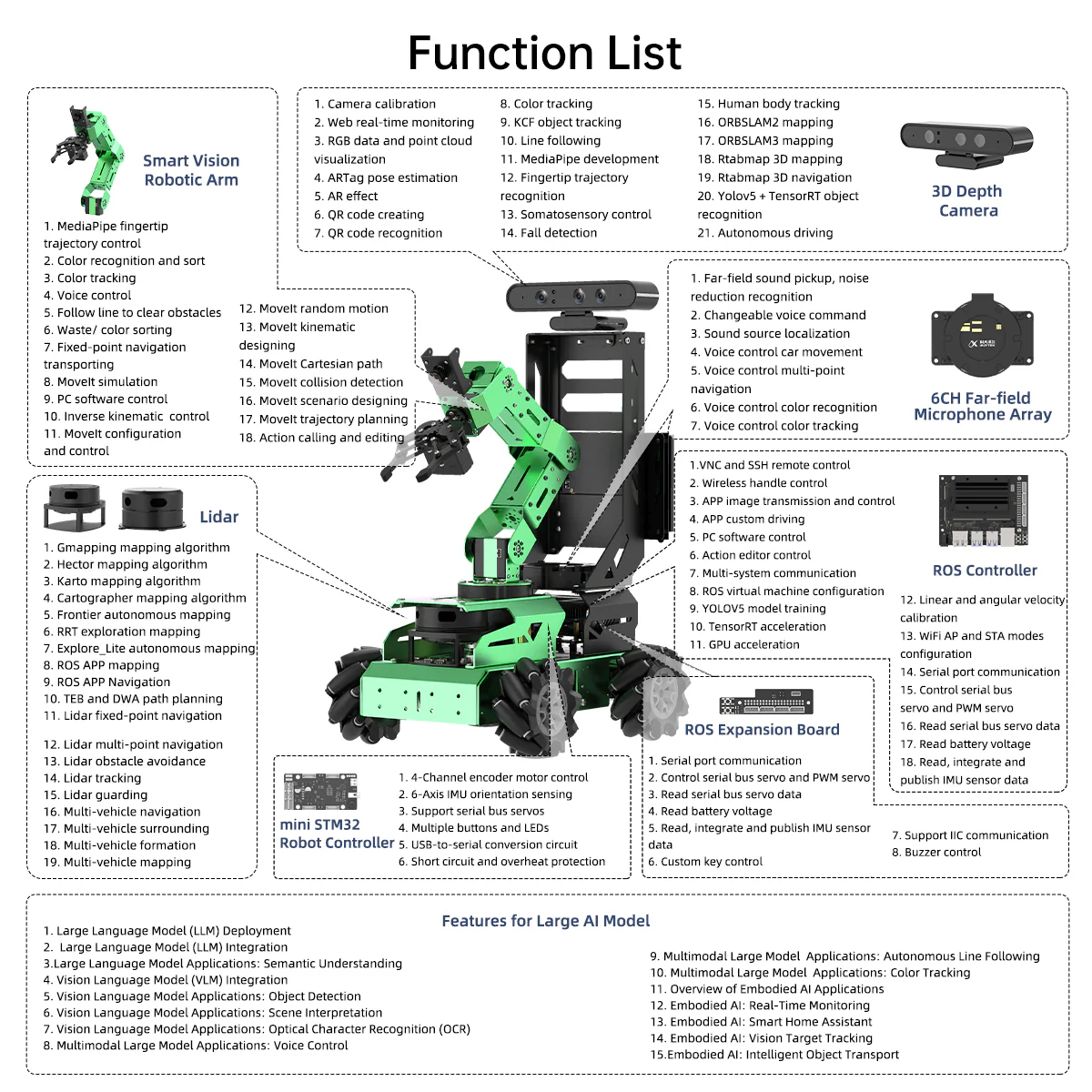 Hiwonder JetAuto Pro Xe Robot AI với Cánh tay Robot Thị giác 6DOF, Hỗ trợ ROS1 ROS2, tích hợp Mô hình AI Lớn (ChatGPT), Lập bản đồ/Điều hướng SLAM, Tương tác giọng nói AI, Phân loại thông minh 【Robot ROS thông minh điều khiển bởi AI】 JetAuto Pro là nền tảng robot chuyên nghiệp cho học tập và phát triển ROS, sử dụng NVIDIA Jetson / Raspberry Pi 5 và hỗ trợ Robot Operating System (ROS2 & ROS1). Robot tận dụng các framework deep learning phổ biến, tích hợp MediaPipe và hỗ trợ huấn luyện mô hình YOLO. 【Phát triển SLAM và cấu hình đa dạng】 JetAuto Pro được trang bị sự kết hợp mạnh mẽ giữa camera độ sâu 3D và lidar. Robot sử dụng nhiều thuật toán tiên tiến như gmapping, Hector, Karto và Cartographer, cho phép điều hướng đa điểm chính xác, lập kế hoạch đường đi TEB và tránh chướng ngại vật động. 【Cánh tay robot thị giác hiệu năng cao】 JetAuto Pro được trang bị cánh tay robot thị giác 6DOF, sử dụng servo thông minh giao tiếp bus nối tiếp với mô-men xoắn 35 kg. Camera HD được gắn ở đầu cánh tay robot, cung cấp góc nhìn thứ nhất (first-person view) cho các tác vụ gắp vật thể. 【Tương tác giọng nói tầm xa】 Bộ kit JetAuto Pro nâng cao tích hợp mảng 6 micro và loa cho phép triển khai các ứng dụng tương tác người–robot như chuyển đổi văn bản thành giọng nói (Text-to-Speech), định vị nguồn âm thanh 360° và điều khiển lập bản đồ, điều hướng bằng giọng nói. Khi kết hợp với cánh tay robot thị giác, JetAuto Pro có thể thực hiện thao tác gắp và vận chuyển vật thể bằng lệnh giọng nói. 【Điều khiển robot đa nền tảng】 JetAuto Pro cung cấp nhiều phương thức điều khiển như ứng dụng WonderAi (tương thích iOS và Android), tay cầm không dây, Robot Operating System (ROS) và bàn phím, cho phép bạn điều khiển robot linh hoạt theo nhu cầu. 【Được tăng cường bởi Mô hình AI lớn, tái định nghĩa tương tác người–robot】 JetAuto Pro triển khai các mô hình AI đa phương thức với ChatGPT làm lõi, tích hợp thị giác 3D và mảng 6 micro. Sự kết hợp này nâng cao khả năng nhận thức, suy luận và thực thi, cho phép triển khai các ứng dụng embodied AI tiên tiến và mang lại trải nghiệm tương tác người–robot tự nhiên, hiểu ngữ cảnh.
