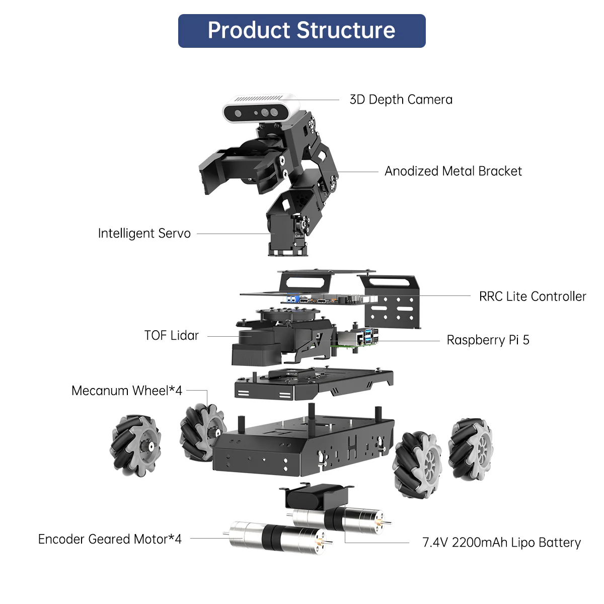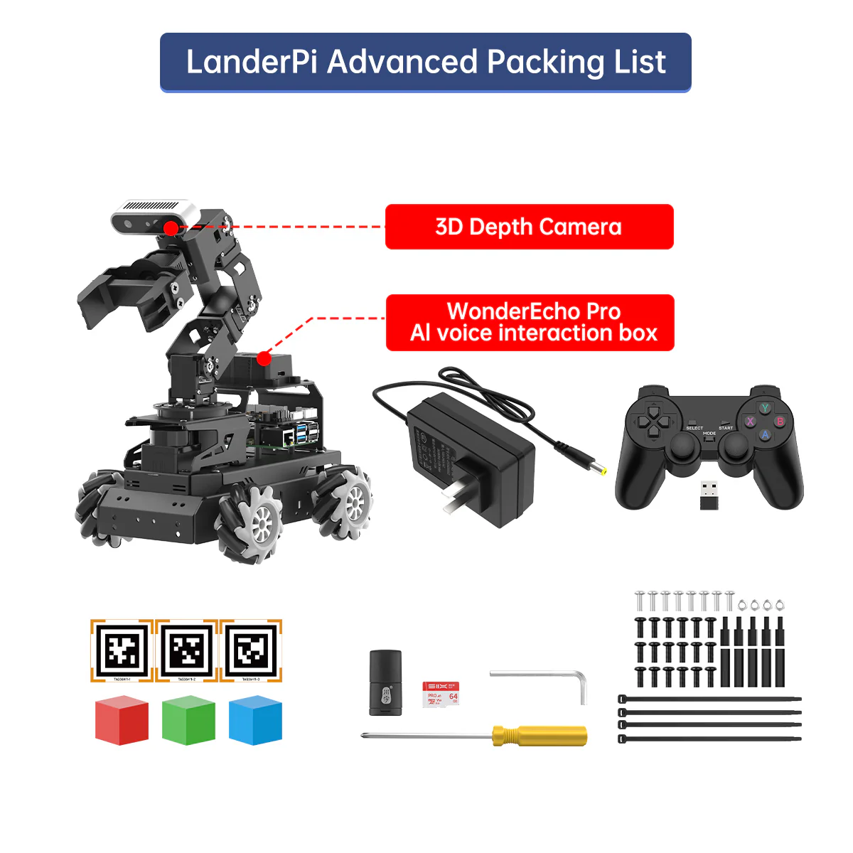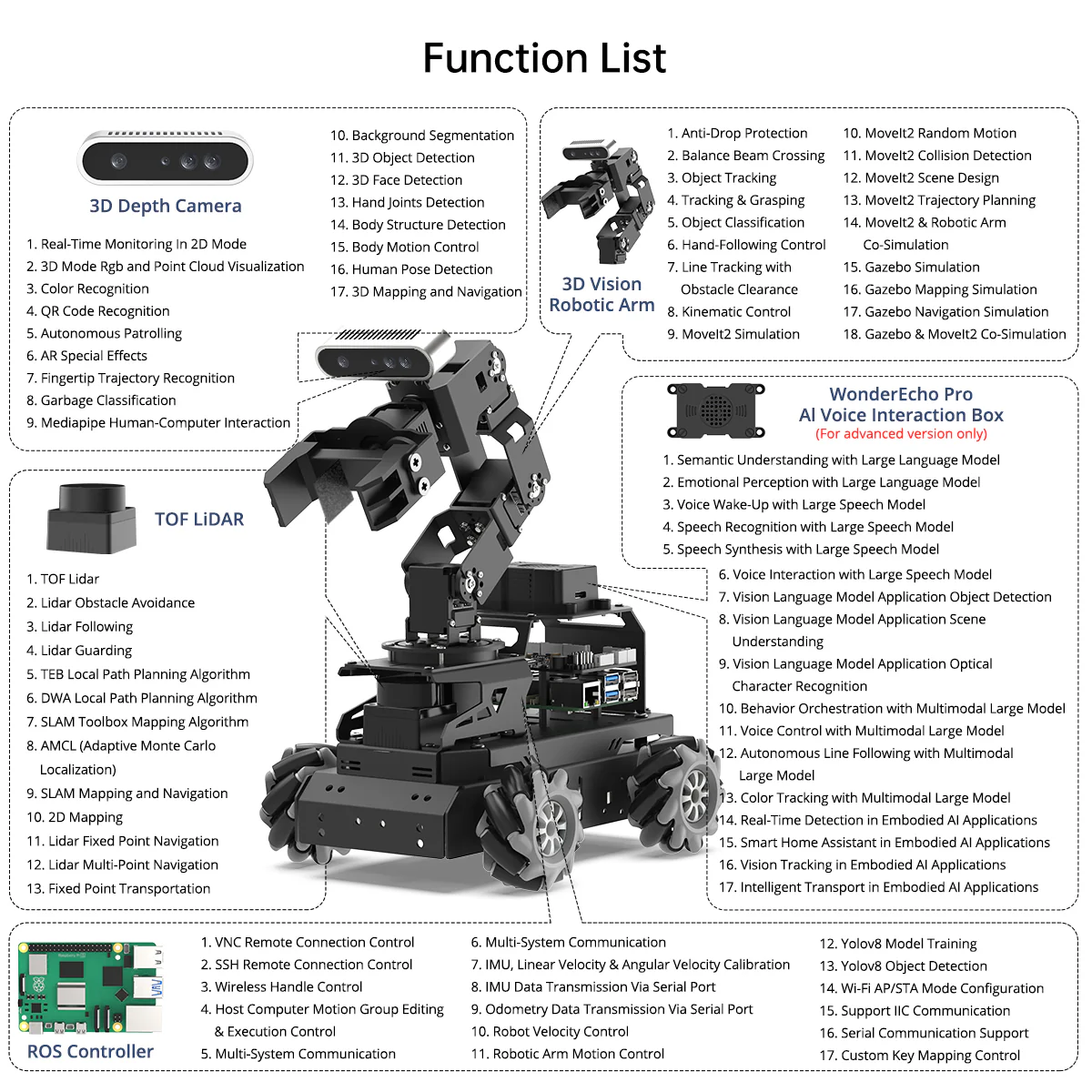 Hiwonder LanderPi Raspberry Pi Robot Car với Cánh tay Robot Thị giác AI, Hỗ trợ ROS2, Mô hình AI Lớn (ChatGPT), Lập bản đồ/Điều hướng SLAM, Tương tác giọng nói AI, Phân loại thông minh 【Xe robot Raspberry Pi 5 & ROS2】 LanderPi được trang bị Raspberry Pi 5, tương thích với ROS2 và lập trình bằng Python, trở thành nền tảng lý tưởng cho việc phát triển robot AI. 【Nhiều cấu hình khung gầm】 Robot LanderPi hỗ trợ bánh Mecanum, khung gầm Ackermann và khung gầm xe tăng, cho phép linh hoạt trong nhiều ứng dụng khác nhau và đáp ứng đa dạng nhu cầu người dùng. 【Phần cứng hiệu năng cao】 Được trang bị động cơ DC encoder hộp số, lidar TOF, camera độ sâu 3D, cánh tay robot 6DOF và nhiều thành phần tiên tiến khác nhằm đảm bảo hiệu suất và hiệu quả tối ưu. 【Khả năng AI nâng cao】 Xe Raspberry Pi LanderPi hỗ trợ lập bản đồ SLAM, lập kế hoạch đường đi, phối hợp đa robot, nhận dạng thị giác, theo dõi mục tiêu và nhiều tính năng khác, bao phủ phạm vi rộng các ứng dụng AI. 【Tự hành với Deep Learning】 Sử dụng huấn luyện mô hình YOLOv8 để nhận diện biển báo giao thông và đèn tín hiệu, cùng nhiều tính năng lái xe tự động khác, giúp người dùng khám phá và phát triển công nghệ xe tự hành. 【Được tăng cường bởi Mô hình AI Lớn, tái định nghĩa tương tác người–robot】 LanderPi triển khai các mô hình đa phương thức với ChatGPT làm lõi, tích hợp cánh tay robot thị giác 3D và hộp tương tác giọng nói AI. Sự kết hợp này nâng cao khả năng nhận thức, suy luận và thực thi, cho phép triển khai các ứng dụng embodied AI tiên tiến và mang lại trải nghiệm tương tác người–robot tự nhiên, hiểu ngữ cảnh.