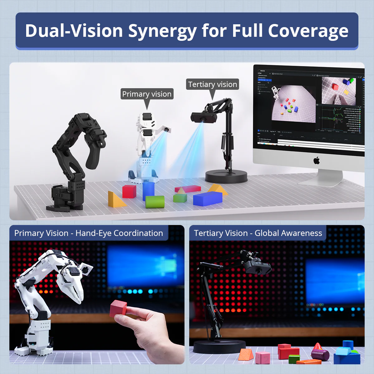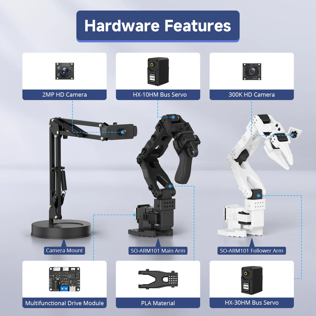 Hiwonder LeRobot SO-ARM101 Cánh tay robot 6 trục mã nguồn mở với thị giác AI & nhận diện AI dành cho lập trình trí tuệ hiện thân 【Tích hợp liền mạch với Hugging Face】 SO-ARM101 là cánh tay robot trí tuệ hiện thân được xây dựng trên dự án Hugging Face LeRobot, kết nối liền mạch với hệ sinh thái, cung cấp quyền truy cập dễ dàng vào mã nguồn dùng chung, các mẫu (template) và mô hình đã được huấn luyện sẵn. 【Học bắt chước end-to-end】 Sử dụng framework AI của Hugging Face, cánh tay robot thu thập dữ liệu thông qua điều khiển từ xa (teleoperation) để huấn luyện mô hình, cho phép tự động thực hiện nhiệm vụ và thích nghi với môi trường. 【Hệ thống thị giác hai camera】 Được trang bị cả camera gắn trên kẹp và camera bên ngoài, hệ thống hỗ trợ thao tác chính xác và nhận thức môi trường, giúp việc học bắt chước đạt độ chính xác cao. 【Servo hiệu suất cao】 Sở hữu sáu servo mô-men xoắn cao 30KG với phản hồi từ tính, cánh tay robot mang lại chuyển động mượt mà, ổn định, khắc phục các vấn đề như thiếu công suất và rung giật. 【Phần mềm PC trực quan chuyên nghiệp】 Tích hợp các chức năng như quét servo, giám sát trạng thái và điều khiển quỹ đạo, bo mạch gỡ lỗi BusLinker V3.0 giúp đơn giản hóa việc điều khiển và debug thiết bị.