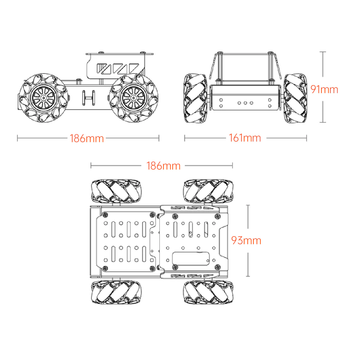 Hiwonder Bộ kit xe khung gầm bánh Mecanum với động cơ TT, khung hợp kim nhôm, xe robot thông minh cho giáo dục DIY Sử dụng bánh xe Mecanum mới nhất để di chuyển Tỷ số truyền của động cơ là 1:120 Kích thước: 180 × 140 × 89 mm, chịu tải lên đến 1500g Bộ kit xe khung gầm bánh Mecanum là bộ DIY, phù hợp cho người đam mê robot