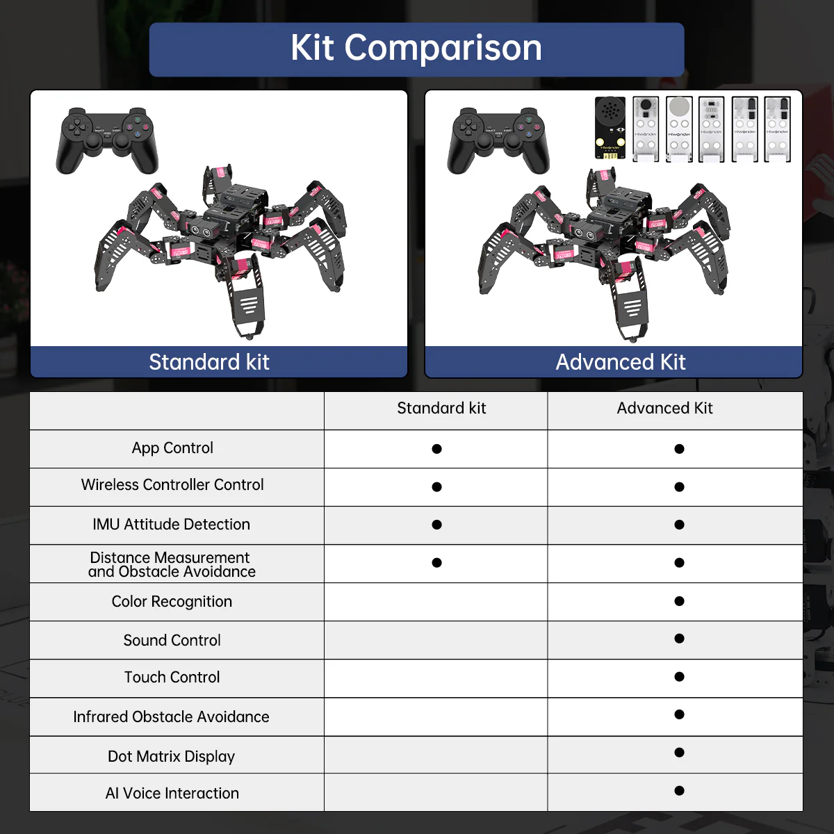 Hiwonder Spiderbot Robot lập trình Arduino với điều khiển giọng nói AI và mở rộng cảm biến 【Lập trình Arduino, mã nguồn mở】 Spiderbot tương thích với lập trình Arduino. Các chương trình của Spiderbot đều là mã nguồn mở, đi kèm hướng dẫn học tập và các ví dụ phát triển nâng cao, giúp bạn dễ dàng phát triển robot của mình. 【Hiệu năng cao, hỗ trợ mở rộng cảm biến】 Spiderbot được trang bị cảm biến siêu âm phát sáng, module ma trận LED, servo bus thông minh và nhiều phần cứng hiệu năng cao khác. Ngoài ra, robot còn cung cấp nhiều cổng mở rộng để tích hợp các cảm biến như cảm biến gia tốc, cảm biến chạm, cảm biến âm thanh, v.v., giúp người dùng phát triển thêm các ứng dụng nâng cao. 【Nhiều tùy chọn điều khiển】 Spiderbot hỗ trợ điều khiển bằng phần mềm PC, ứng dụng di động và tay cầm không dây.