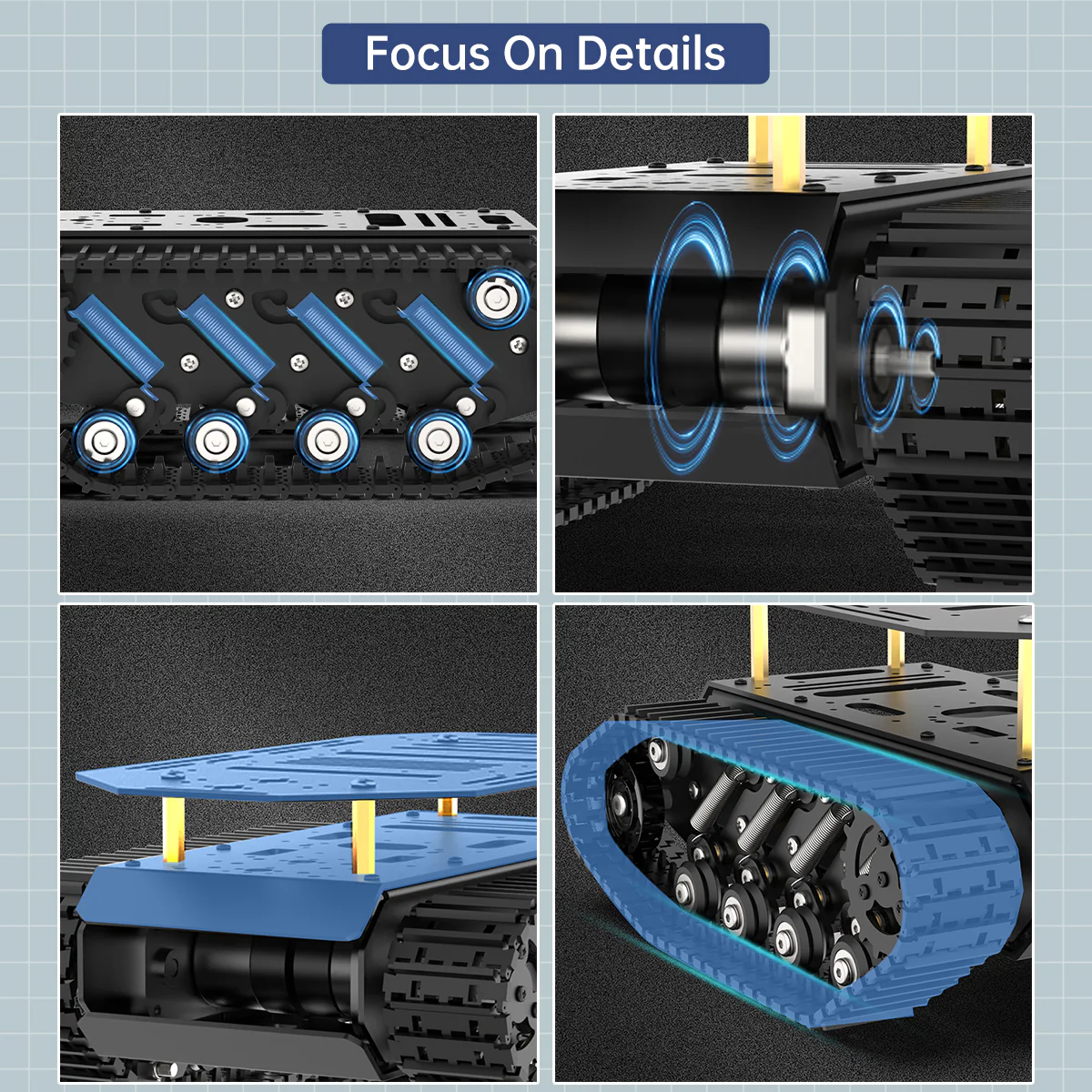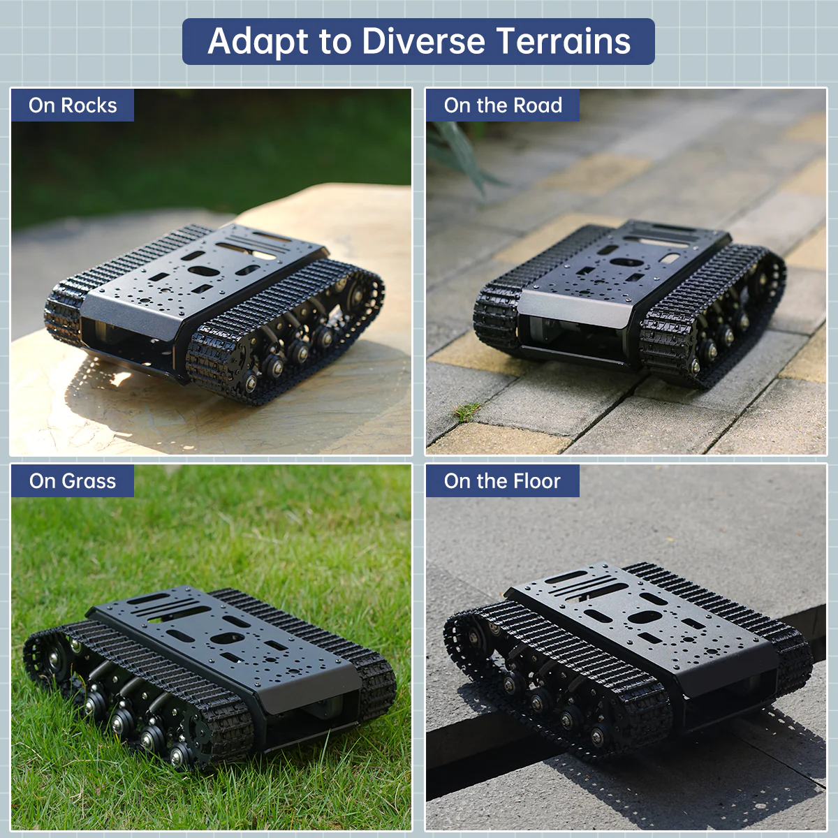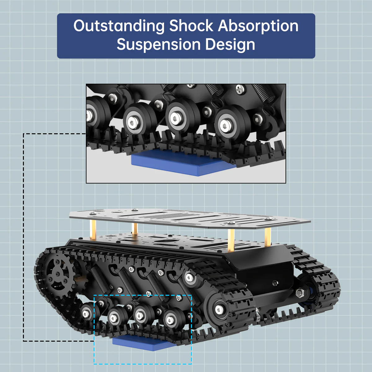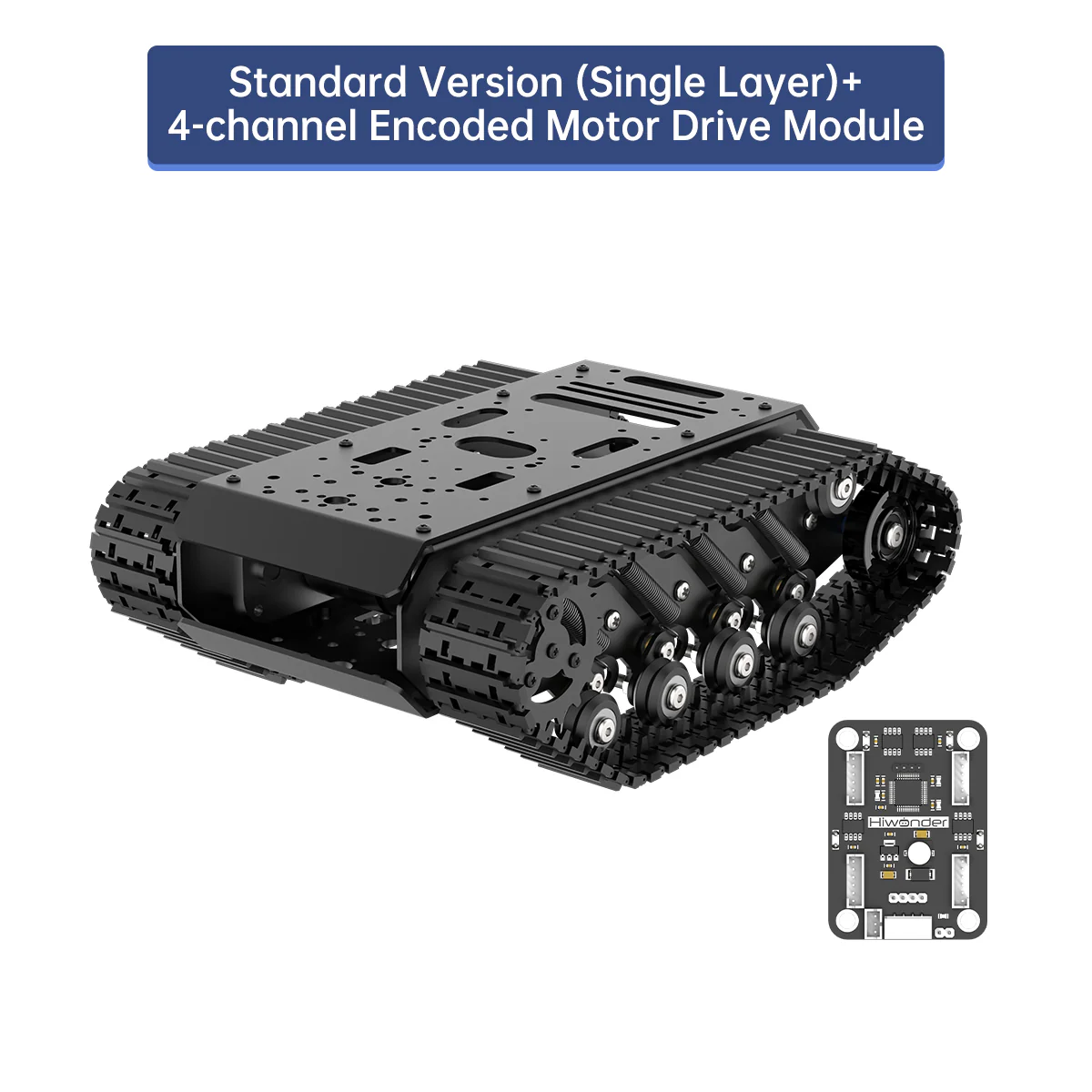 Khung gầm bánh xích Hiwonder / giảm xóc treo toàn kim loại cho robot xe tăng / khung xe robot thông minh dùng động cơ encoder 【Hiệu quả giảm rung chất lượng cao】 Khung gầm được tích hợp lò xo kéo bằng thép carbon đàn hồi cao 8 kênh và trang bị vòng bi nhỏ, đảm bảo khả năng di chuyển linh hoạt trên nhiều loại địa hình khác nhau. 【Khung robot xe tăng chắc chắn】 Thân chính được chế tạo từ hợp kim nhôm và xử lý bề mặt anod hóa, mang lại vẻ ngoài tinh xảo. Lớp trên cùng có thể tháo rời dễ dàng, thuận tiện cho việc phát triển DIY. 【Mở rộng chức năng đa dạng】 Khung có nhiều cổng mở rộng và hoàn toàn tương thích với các bộ điều khiển phổ biến trên thị trường như Jetson Nano, Raspberry Pi, Arduino, v.v. Bạn cũng có thể gắn thêm nhiều cảm biến và servo để xây dựng robot của riêng mình. 【Ứng dụng】 Phù hợp cho người đam mê, giáo dục, thi đấu và các dự án nghiên cứu. Nhiều trường học và đơn vị giáo dục lựa chọn khung xe này để giảng dạy kiến thức robot AI cho học sinh. 【Sự khác biệt phiên bản】 Phiên bản tiêu chuẩn là khung bánh xích một tầng; phiên bản nâng cao là khung bánh xích hai tầng.