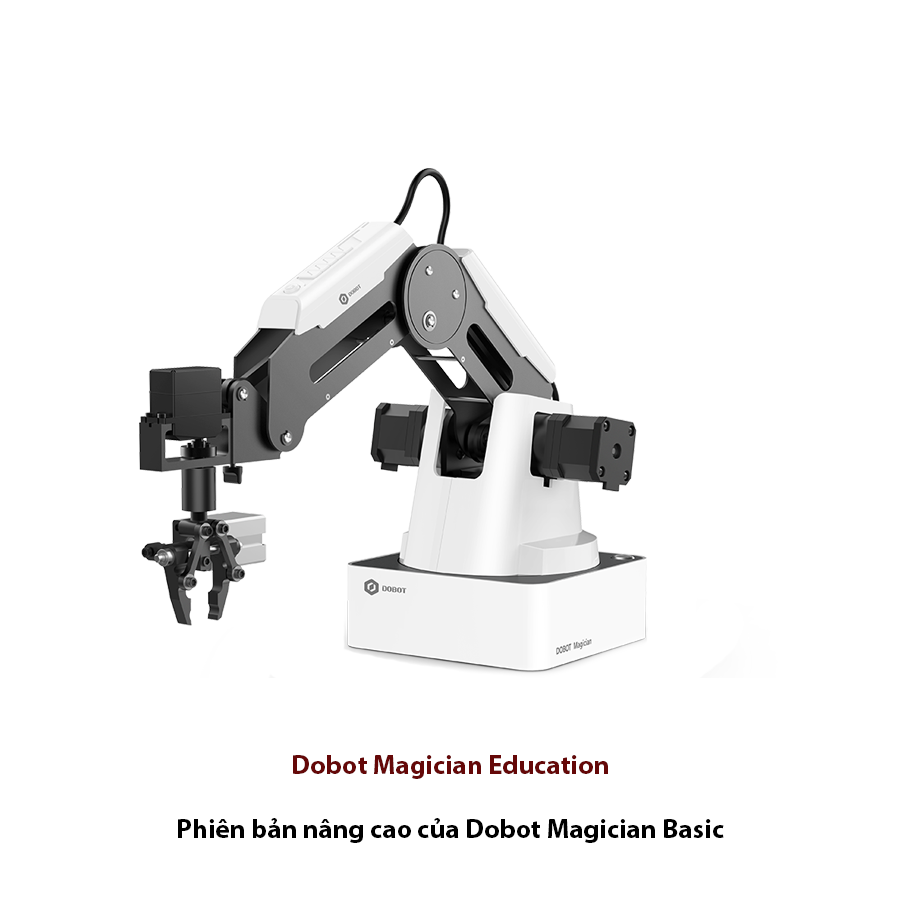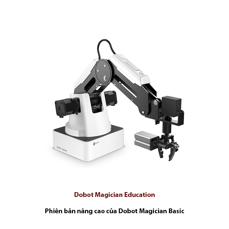 Dobot Magician Education Dobot Magician Education là phiên bản nâng cao của Dobot Magician Basic hỗ trợ thêm nhiều loại phụ kiện: ▪ Lazer Kit ▪ Bluetooth/Wifi module ▪ Tay cầm điều khiển ▪ Giấy Kraft Liner (Khắc Laser) DOBOT Sensor Kit dành cho Magician Basic/Education Bộ Cảm biến cho Magician có thể được lập trình bằng Python và lập trình đồ họa. Sản phẩm này rất dễ làm quen và phù hợp cho người mới bắt đầu. Bộ kit bao gồm Magic Box và Bộ Camera AI để cho phép thực hiện nhiều kịch bản tự động hóa hơn. Các loại cảm biến: Cảm biến ánh sáng, Cảm biến núm vặn, Cảm biến âm thanh, Cần điều khiển, Cảm biến độ ẩm và nhiệt độ, Cảm biến cử chỉ, Cảm biến màu sắc, Module LED, Cảm biến hồng ngoại thụ động PIR, Nút nhấn kép, Công tắc quang điện, Động cơ Micro servo.