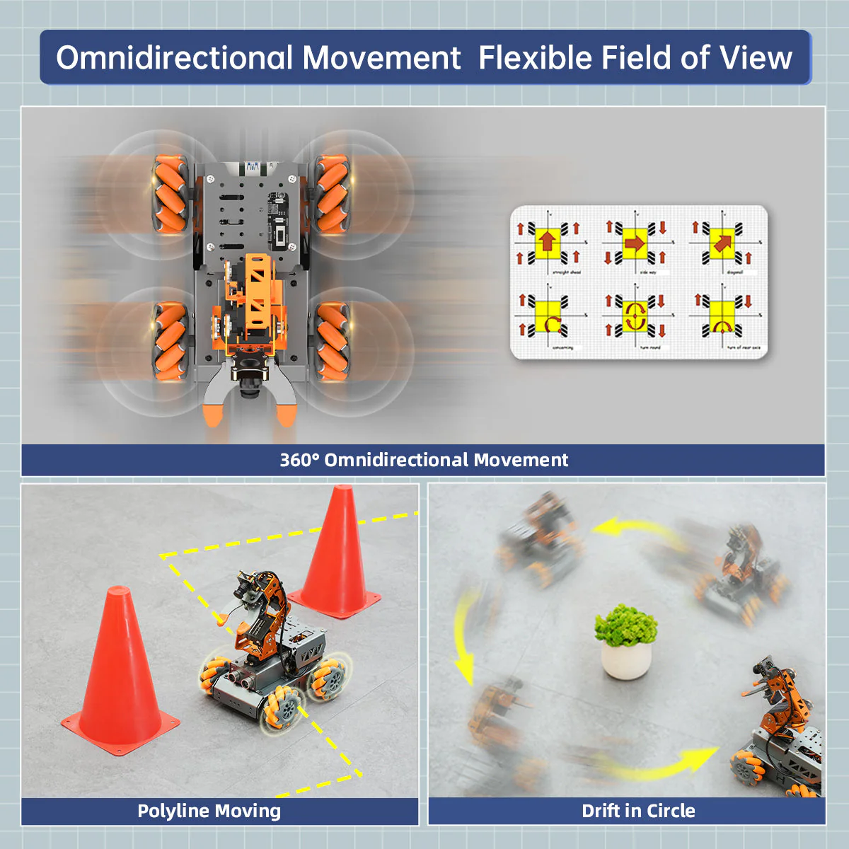 MasterPi Hiwonder Xe robot AI thị giác với cánh tay robot và bánh Mecanum sử dụng Raspberry Pi 5, mã nguồn mở 【Robot thị giác AI sử dụng Raspberry Pi】 MasterPi hỗ trợ lập trình Python. Sản phẩm được xây dựng trên khung gầm bánh Mecanum, servo bánh răng kim loại chất lượng cao và camera HD. 【Cánh tay robot thị giác】 MasterPi sử dụng cánh tay robot 5DOF và camera HD để định vị vật thể chính xác và tự động gắp vật. 【Di chuyển đa hướng 360°】 Bánh xe Mecanum đa hướng tiên tiến cho phép robot di chuyển linh hoạt theo mọi hướng 360°. 【Điều khiển từ xa qua ứng dụng】 Xe robot MasterPi cho phép điều khiển theo thời gian thực các chuyển động, thao tác gắp và vận chuyển thông qua ứng dụng chuyên dụng trực quan. 【Tài liệu hướng dẫn phong phú】 MasterPi cung cấp hướng dẫn chi tiết về điều khiển chuyển động, thị giác AI, lập trình phần mềm PC, OpenCV và nhiều nội dung khác. Bộ tài liệu giúp bạn tự tin lắp ráp, lập trình và sáng tạo.