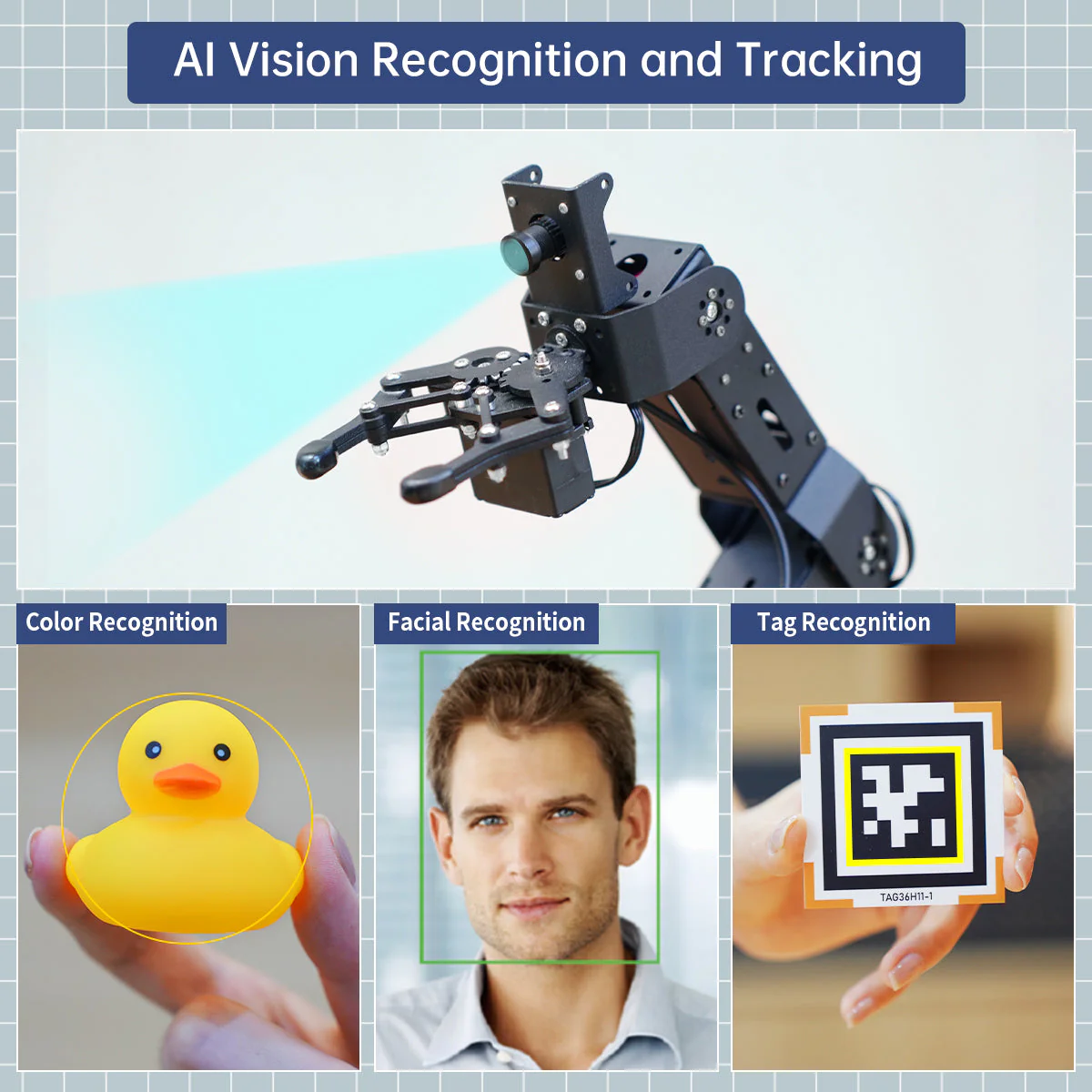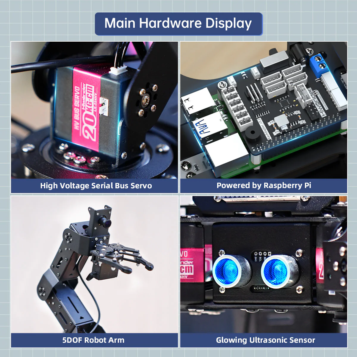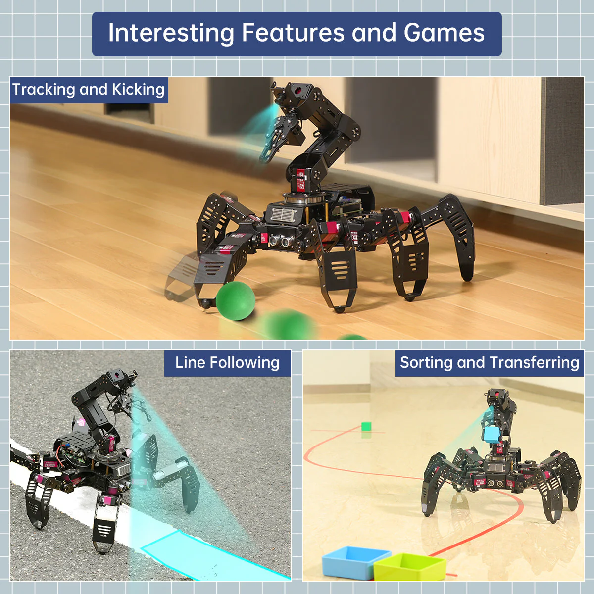 SpiderPi Pro: Hiwonder Robot nhện sáu chân với cánh tay robot thị giác AI sử dụng Raspberry Pi 5 【Robot nhện AI sử dụng Raspberry Pi】 SpiderPi Pro cung cấp nền tảng lý tưởng để nghiên cứu điều khiển chuyển động của robot sáu chân, thị giác máy tính, OpenCV, học sâu, v.v. 【Tích hợp cánh tay robot thị giác AI】 Được trang bị cánh tay robot thị giác 5DOF, giúp SpiderPi Pro có thể định vị, theo dõi, gắp, phân loại và xếp chồng vật thể mục tiêu một cách chính xác. 【Thị giác AI cho ứng dụng sáng tạo】 Sở hữu camera HD góc rộng và OpenCV, hỗ trợ nhiều ứng dụng thị giác AI như tránh chướng ngại vật. 【Điều khiển qua app & FPV trực tiếp】 Hỗ trợ điều khiển từ xa và truyền video HD theo thời gian thực, giúp bạn điều khiển robot mọi lúc mọi nơi. Góc nhìn thứ nhất (FPV) mang lại độ chính xác và khả năng tương tác cao hơn. 【Động học nghịch, nhiều chế độ dáng đi】 SpiderPi Pro sử dụng thuật toán động học nghịch để hỗ trợ nhiều kiểu dáng đi như tripod và quadruped. Ngoài ra, robot còn cho phép điều chỉnh độ cao, tốc độ, cũng như khả năng rẽ và thay đổi hướng di chuyển.